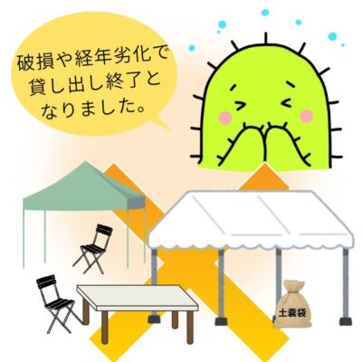 サポセンではこれまで、市民活動のイベントや講座などで必要な備品類を貸し出してまいりましたが、下記の備品については、経年劣化および破損により利用者の安全を十分に確保できなくなったため、貸し出しを終了することとなりました。何とぞご理解とご協力のほど、お願い申し上げます。