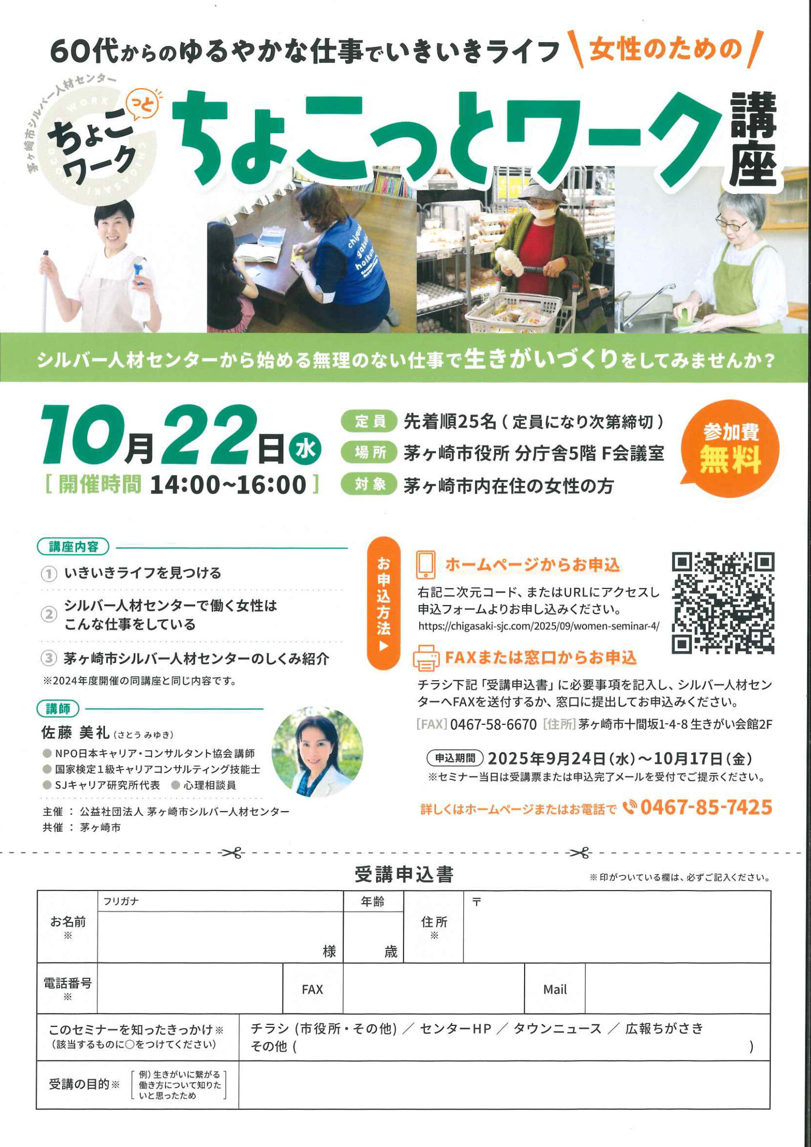 10/22(水)_60代からのゆるやかな仕事でいきいきライフ 女性のための ちょっとワーク講座 講演・講座・研修