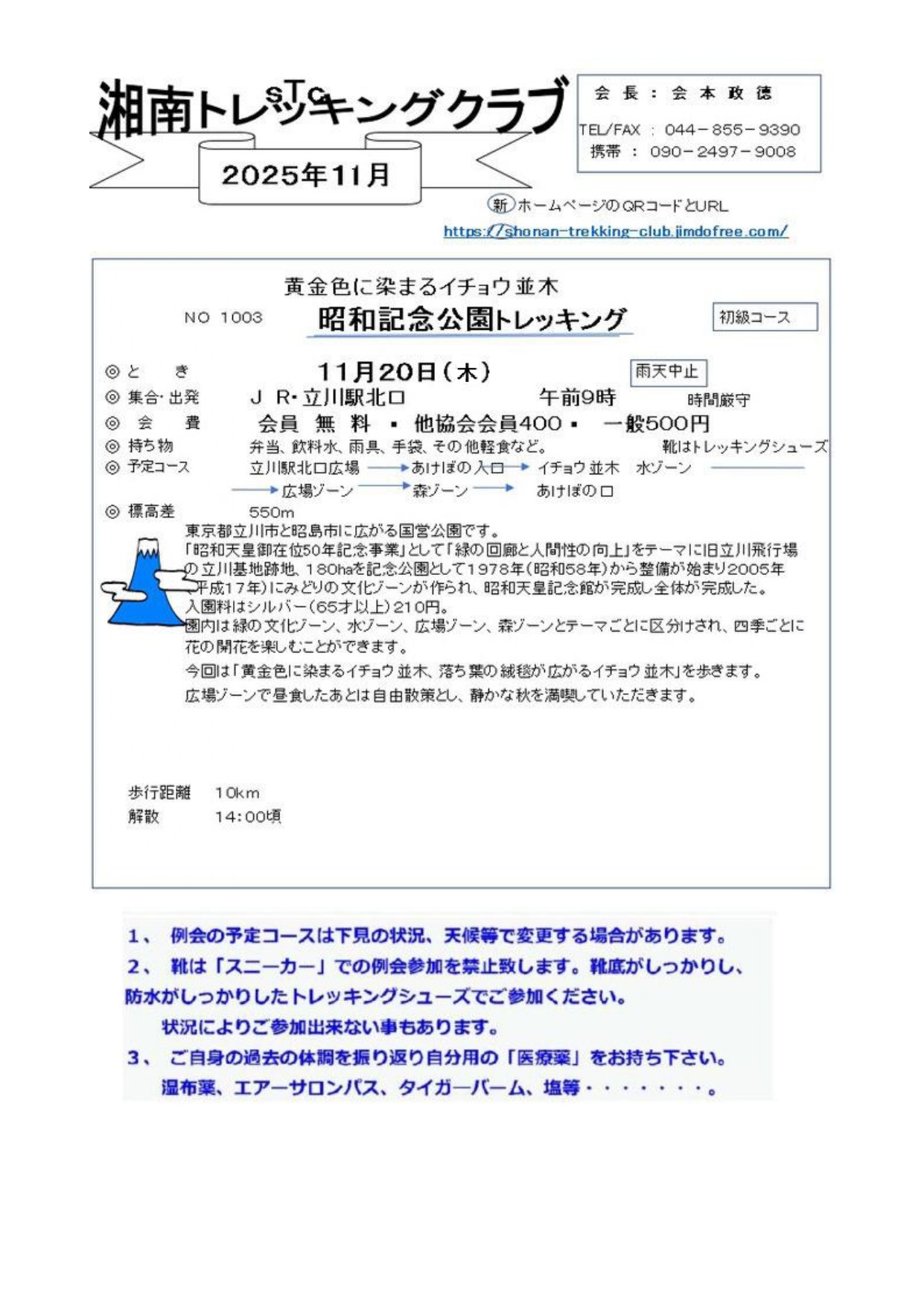 11/20(木)_湘南トレッキングクラブ 黄金色に染まるイチョウ並木 昭和記念公園トレッキング イベント・体験
