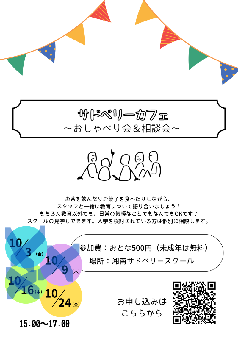 こんにちは。湘南サドベリースクールです。10月最後のサドベリーカフェを開催します。 日 時:2025年10月24日(金) 15:00~17:00 |
