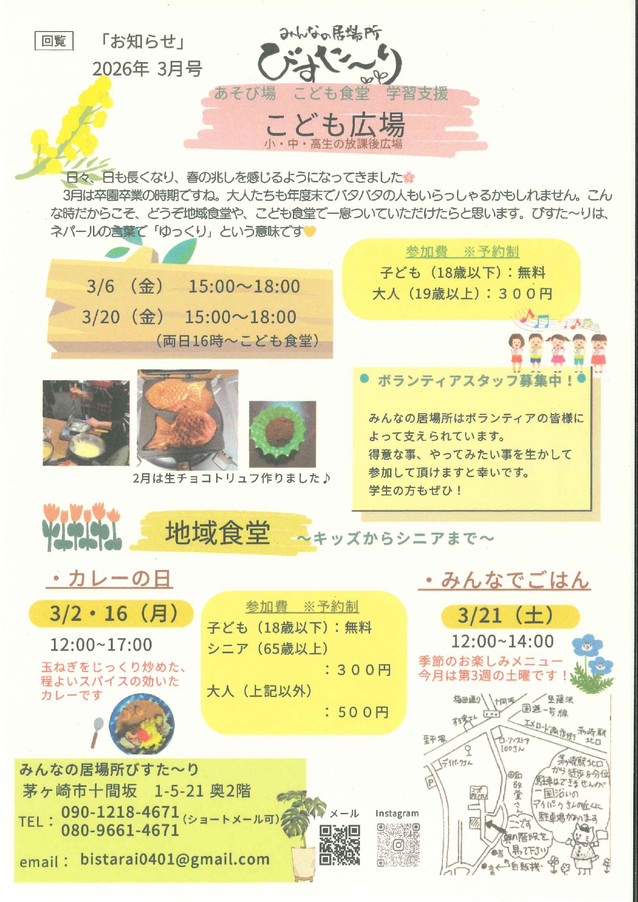 3月号 ~みんなの居場所 びすたーり「こども広場・地域食道」のお知らせ イベント・体験