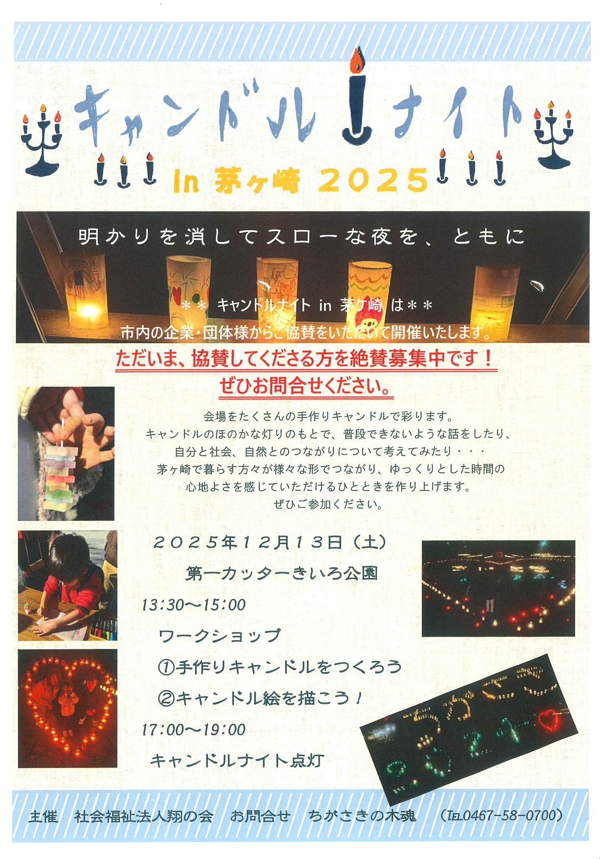 開催場所 第一カッターきいろ公園 13:30~15:00 ワークショップ 17:00~19:00 キャンドルナイト点灯 |