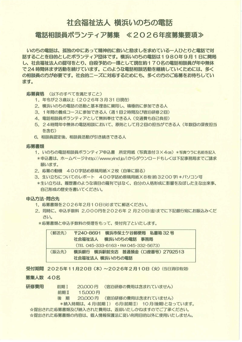 社会福祉法人 横浜いのちの電話 電話相談員ボランティア募集≪2026年度募集要項≫