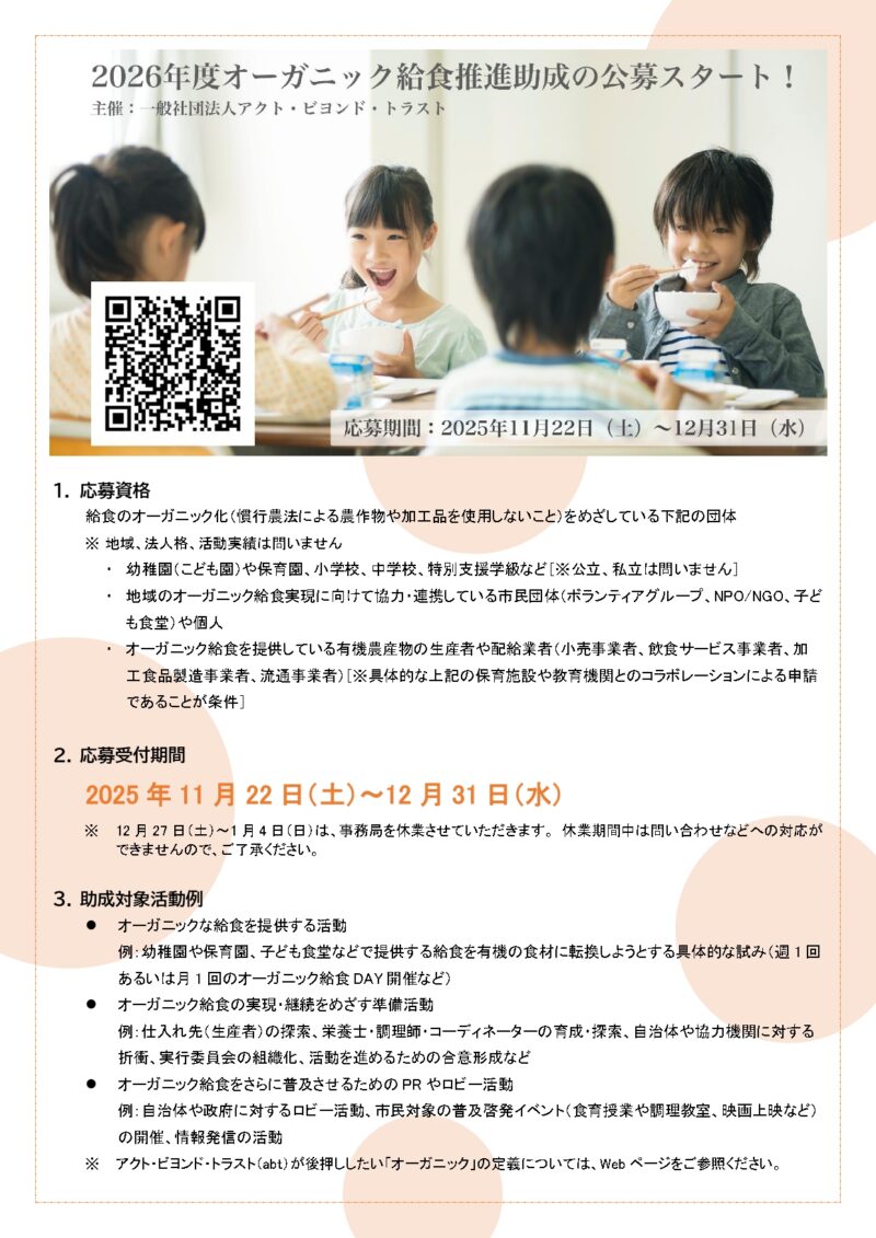 2026年度 オーガニック給食推進助成 ご案内(受付12/31まで)成長過程にある子どもたちの健康を守る社会をめざして ~一般社団法人アクト・ビヨンド・トラスト