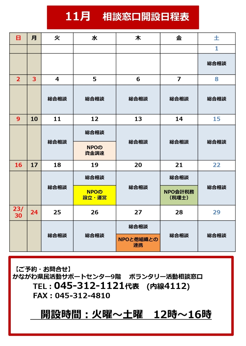 「神奈川県ボランタリー活動相談」11月のご案内 ~相談無料・予約優先、ご利用ください!
