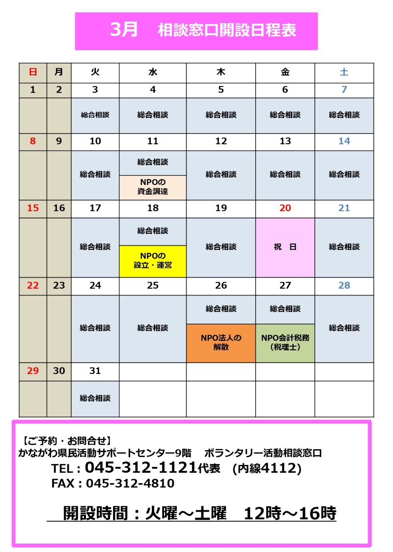 「神奈川県ボランタリー活動相談」3月のご案内 ~相談無料・予約優先、ご利用ください!