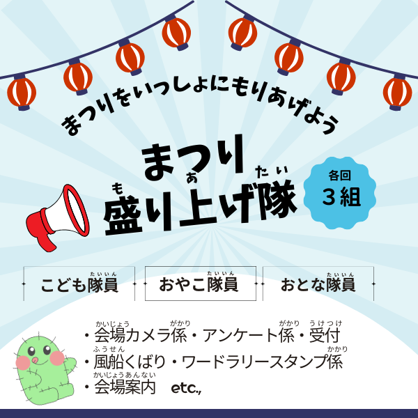内容:会場カメラ係、アンケート係、受付、風船配り、スタンプ係、会場案内 など