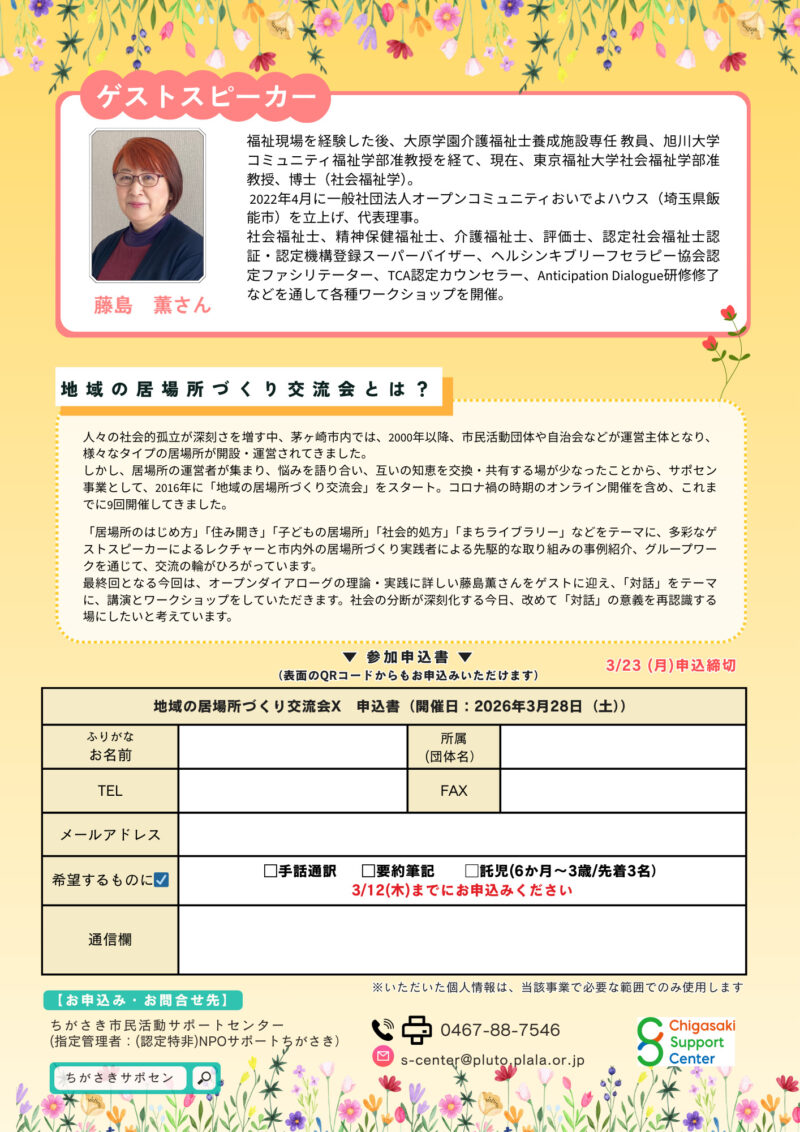 【参加募集】3/28(土) 地域の居場所づくり交流会Ⅹ「対話(ダイアローグ)をベースとした「安心の居場所づくり」」