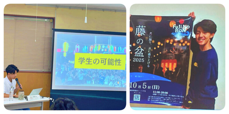 今年の秋には、松山さんが子どもの頃に感じた祭りの記憶を自分の手で再現したいという想いから藤沢駅前広場で開催された「藤の盆2025」を企画。スポンサー探しや出店者集めなど、地域の大人たちの協力を得ながら、学生主体で運営されました。これは単なるイベントではなく、「やってみたい」を形にする学生たちの挑戦の場であり、地域とのつながりを深める時間となりました。これからもニューコロンブスは地域と学生をつなぐプラットフォームとして活動を広げ、未来を切り広げていきたいと若者の熱いエネルギーを感じました。